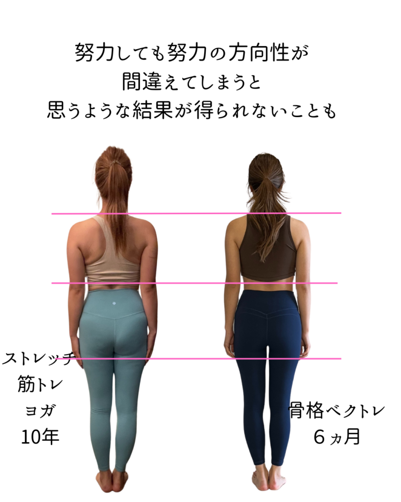 「骨盤が広くて太ももが太い…」そんな下半身のお悩みを長年抱えていたお客様。運動は苦手、肩こり、腰痛がありました。スカートやパンツ選びにいつも迷っていたそうです。そこで骨格から整える【骨格ベクトレ】の1
